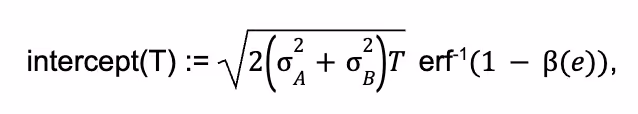 In conclusion, given a specified MDE e, we must identify the appropriate values for the intercept and T parameters to ensure that both type I and type II error constraints are simultaneously met.