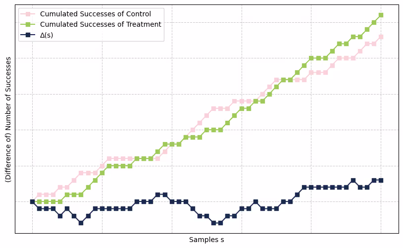 The figure above illustrates the cumulative number of successes for both the control group (in green) and the treatment group (in pink), plotted as a function of the increasing sample size for a specific experiment. The dark blue curve represents the difference between the successes of the treatment and the control groups. The function representing the difference after s samples is denoted by Δ(s). Operating under the premise that each sample may yield a value of 1 with a given probability of success and 0 with the complementary probability of failure, Δ exhibits certain probabilities of either rising by one step, descending by one step, or remaining constant at each point in the sequence. These probabilities are consistent at every step and are independent of the current value of the difference curve. Such behavior characterizes Δ as a specific type of random walk.