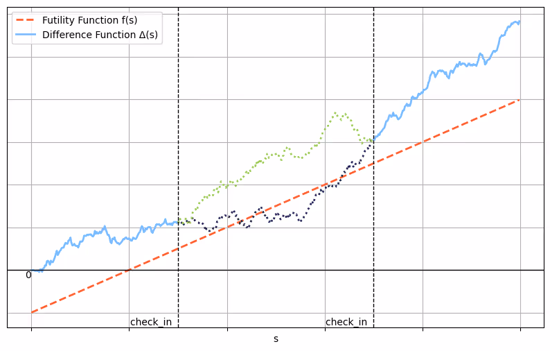 The graph displayed above illustrates a realization of Δ. It is assumed that the trajectory between two check-in points is unobservable. The green and the dark blue dotted lines represent two possible behaviors within this time frame. Both scenarios are equally probable and are merely two among thousands of potential realizations. The difficulty arises from the fact that, in the blue scenario, Δ intersects with the futility function, necessitating the termination of the experiment, whereas in the green scenario, it remains above. Since Δ is above the futility function at the subsequent check-in, one cannot determine the exact path taken in the interim with certainty.