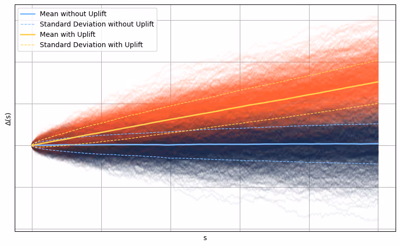 As the sample size increases, a fascinating divergence occurs: the red curves, representing the experiments with a higher success probability for the treatment, begin to drift markedly away from the blue ones. This separation accelerates, with the gap between their respective averages widening at a rate that outpaces the growth of their fluctuations. This very characteristic empowers us to identify an uplift, provided the experiment is allowed to run for a sufficient duration.