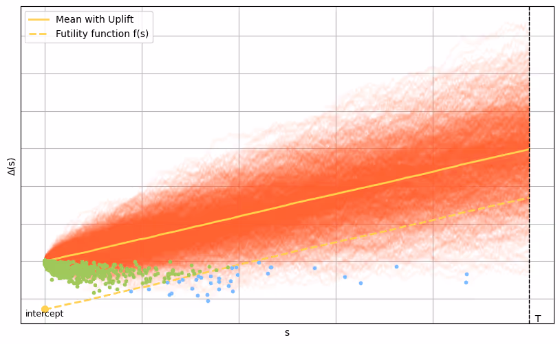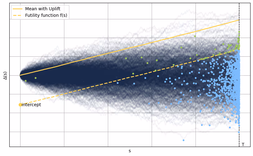 The two charts above illustrate the two scenarios separately: one demonstrating an uplift and the other lacking it. In both charts, the average trajectory of the uplift scenario, represented by a solid yellow line, has a gradient of e. Furthermore, a circular marker accentuates the lowest point on each individual trajectory. The color of these markers varies, depending on whether they fall above or below the futility threshold, which is depicted as a dashed yellow line. This futility function, denoted as f(s), is defined by the equation f(s) = intercept + s * e.