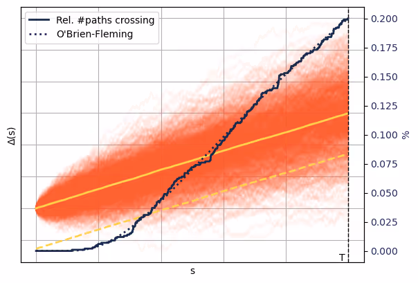 The graph above illustrates the proportion of sampled trajectories that have encountered the futility function up to a given sample size “s,” represented by the dark blue line. Note that it reaches the level of β(e) = 20% at the maximum sample size “T”. Beneath the solid blue line is another dotted line representing the O’Brien-Fleming spending curve, a widely recognized spending function. The function is defined as follows: