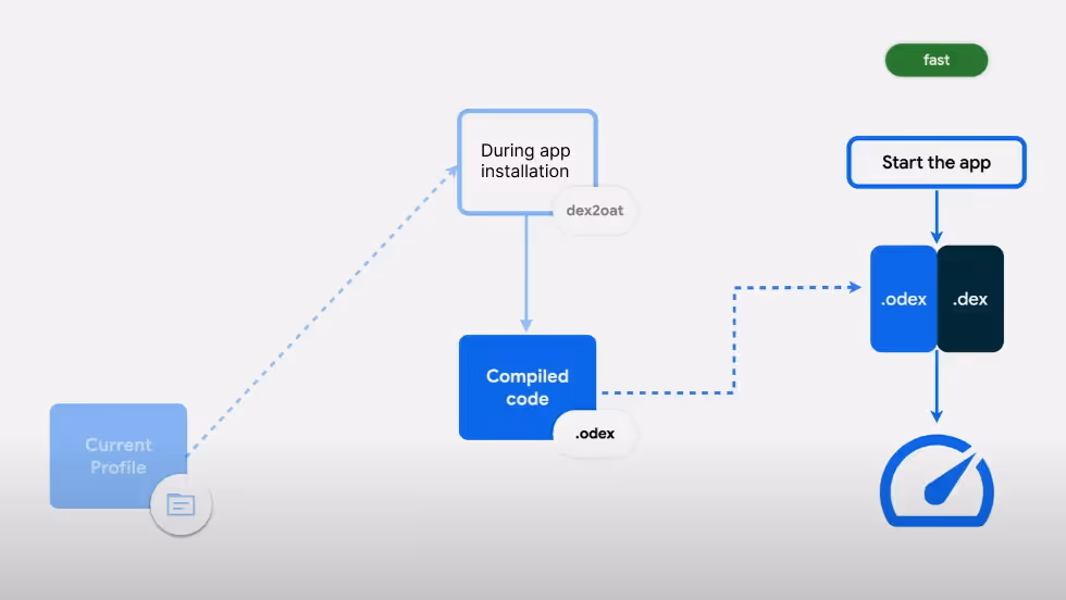 When the app is installed, the dex2oat compiler converts these profiles into optimized dex files (odex). Upon app startup, both the odex and the original dex files are available, optimizing the critical parts of the app and enhancing performance.