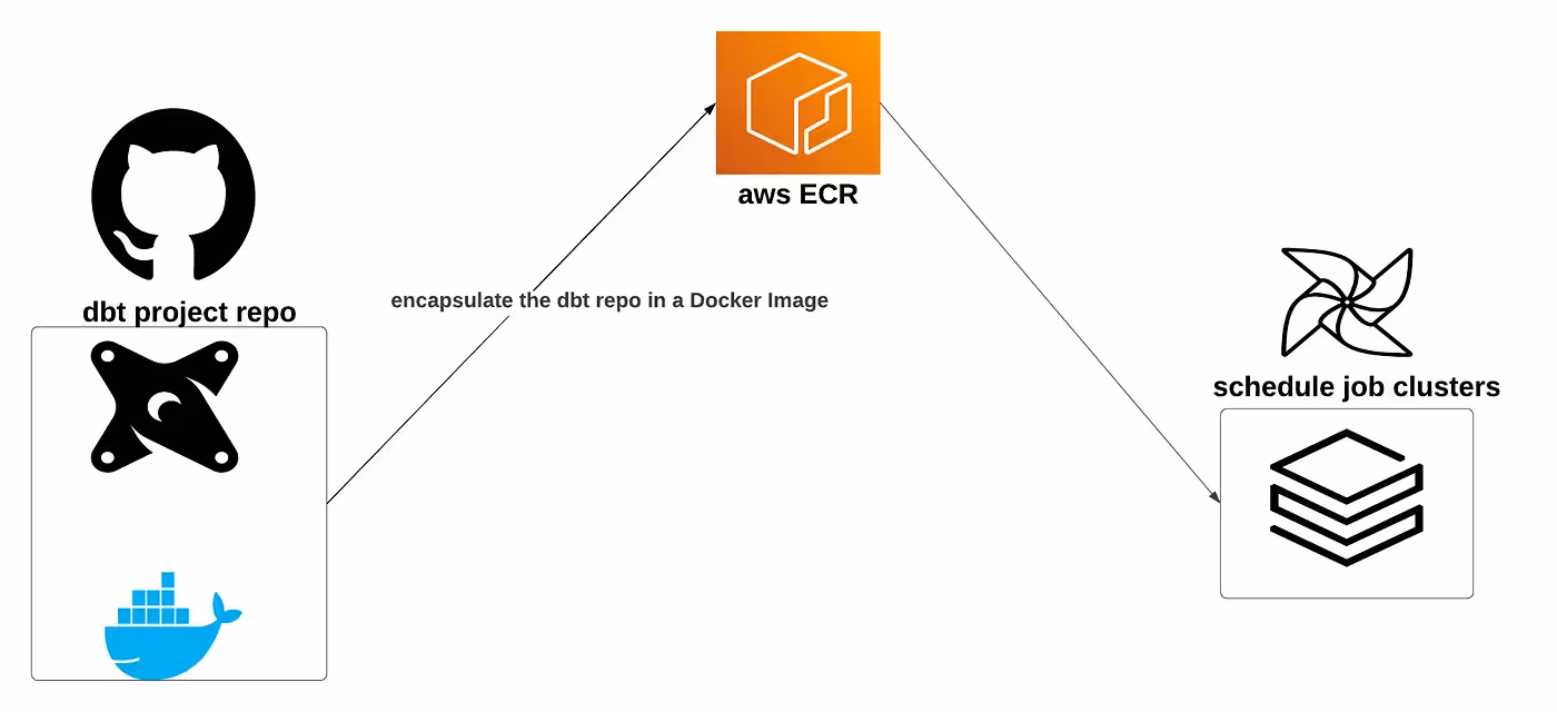 At GetYourGuide, we developed a solution leveraging Docker, encapsulating the dbt project along with a dbt-spark adapter’s profiles file. This approach involved creating a Dockerfile that bundled the necessary configurations and then pushing the resulting Docker image to a private container registry. Once in the registry, this image was deployed using theDatabricks job run API, enabling the seamless execution of dbt tasks within job clusters.