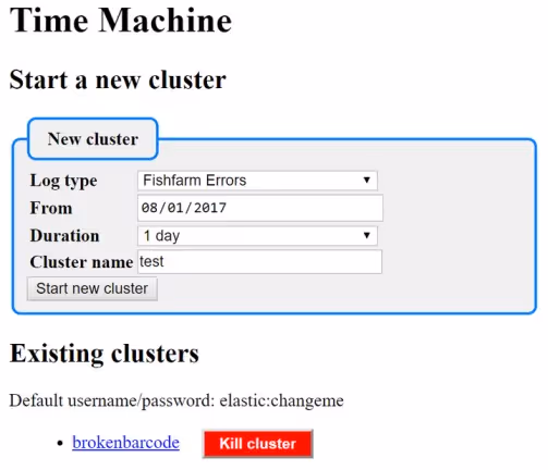 Our final solution provides our developers with a web interface where they can select the type of log file to analyze and the date range they are interested in. After defining a cluster name, the needed containers are started and the user is provided with a link to the corresponding Kibana instance. After the analysis is done, the cluster can be killed from the web interface. In practice, it looks like this: