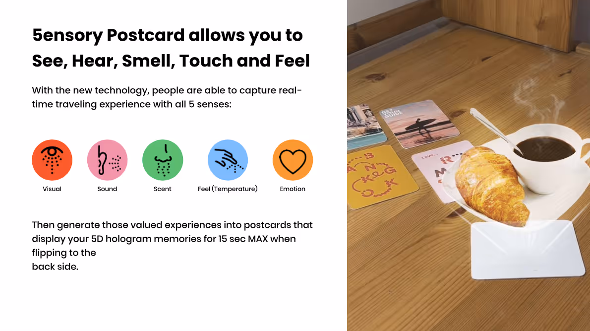 For their project, Sruangrat Harnsiriwattana, Yiyang He, and Mine Gunduz looked to the potential of holographic VR as well as other technologies to imagine 5ensory Postcards. Envisaged as a paired device delivered by GetYourGuide, the futuristic gadget will allow travelers to share with loved ones those experiences that currently can’t be captured. Covering visual, sound, scent, touch, and even emotion, the postcards will also allow explorers of tomorrow to experience landscapes and locales that may no longer exist due to climate change.