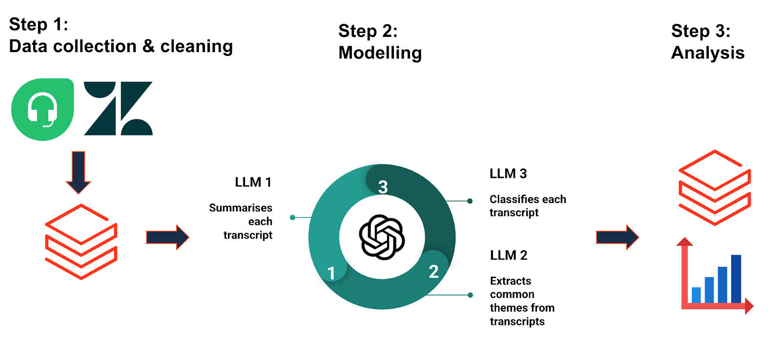 Our analysis pipeline involved cleaning customer care tickets and supplier emails in Databricks, using the OpenAI API to model the data, and transforming it into actionable insights. We began by gathering all conversations between suppliers and potential customers, focusing specifically on those related to multi-day tours. A large language model (LLM) via the OpenAI API was used to simplify each conversation. These simplified dialogues were then processed through another LLM to extract common topics and themes.