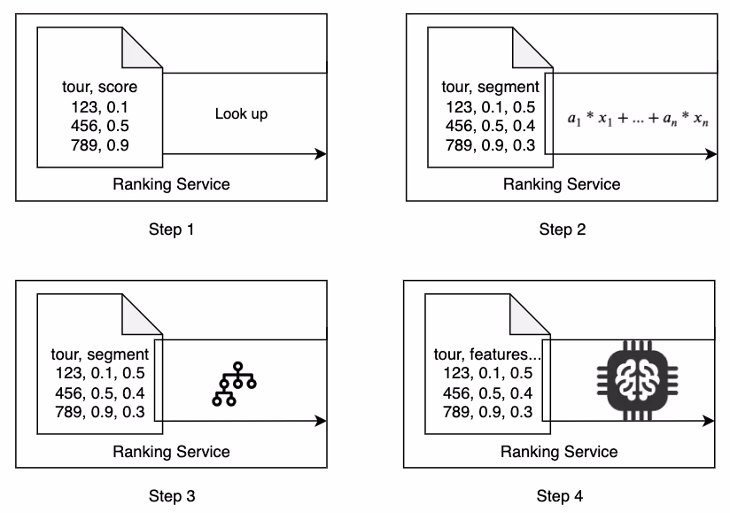 Previously, our system relied on daily batch scoring of every activity in our inventory, with our search service then ranking the activities based on these scores. While this approach was simple to maintain, it had significant drawbacks. It was challenging to personalize the ranking, and it required dependency on other teams when we wanted to test a new scoring or a new logic. Every change ended up taking multiple weeks or even months to be implemented.