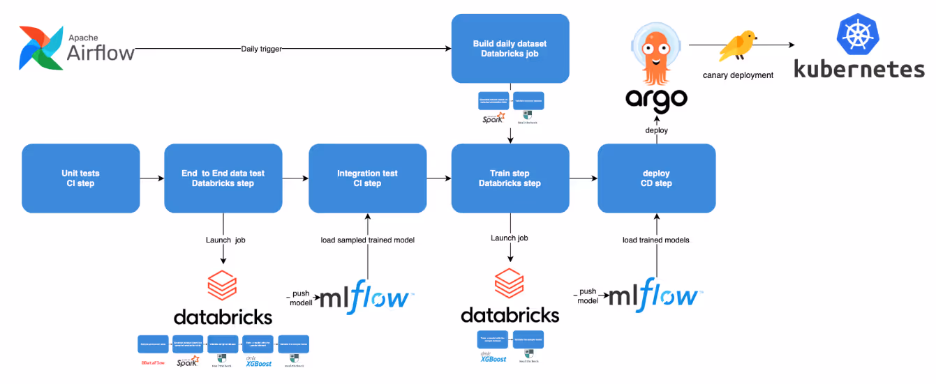 - Production Model Training: Every merge to our master branch triggers a training job, resulting in the creation of a new model. This means that a fresh model is generated with every code update, ensuring our system is always up-to-date. When the change is unrelated to the model, we can skip the change; see this blog post for the overall architecture