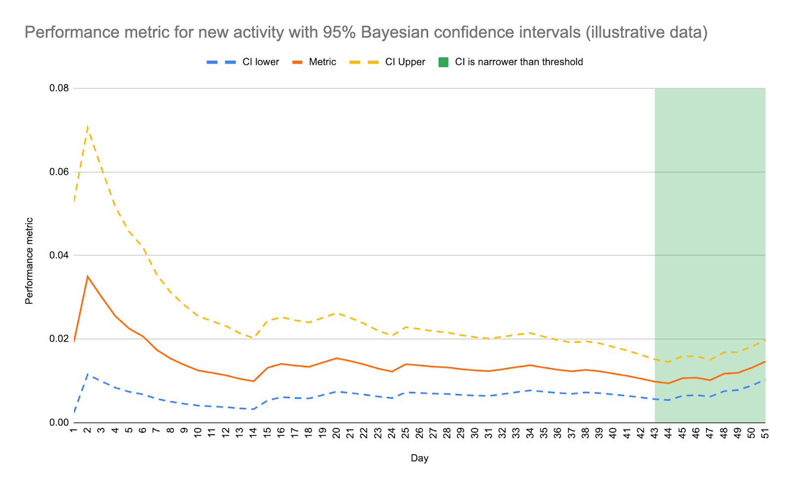 - On day 43, the CI was narrower than a pre-defined threshold for the performance metric. In our system, this means we do not expect more value to come from exploring the activity further, as we have an estimation of performance that we consider good enough. All the measurements that happened after day 43 have the green background.