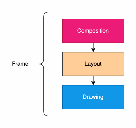 It’s virtually possible that Compose might execute three phases in each frame. This is a unidirectional flow that happens from composition to drawing to produce a frame.