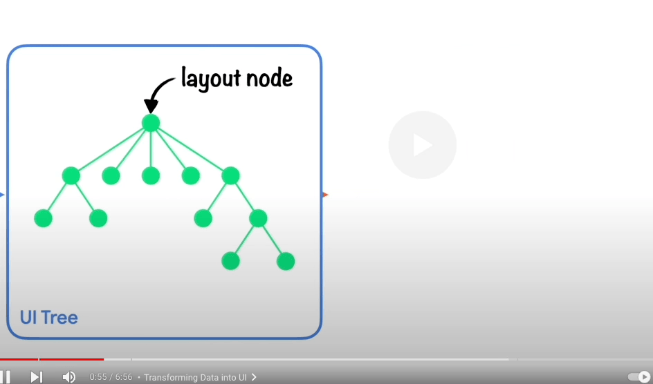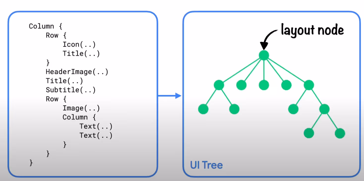 - Composition: What UI to show? Builds a UI tree of compose functions.