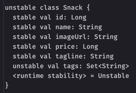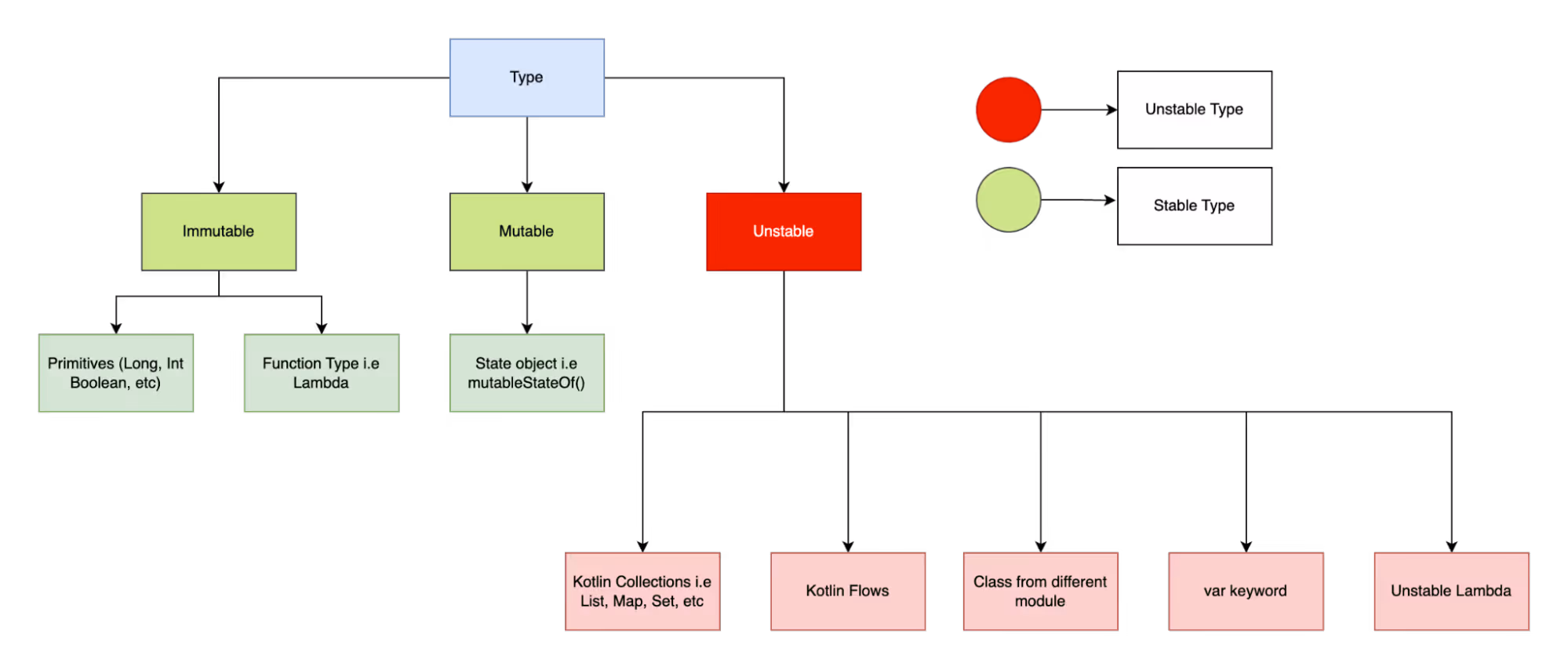 This class holds a mutable data type that does not notify Compose Runtime upon a change in data. Compose Runtime is unable to validate whether these have changed or not. That’s why Stable inference algorithms treat it as Unstable. If one or more class parameters are unstable, then the stability of that class is also considered Unstable.