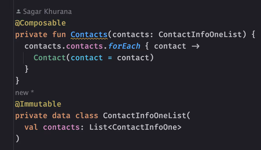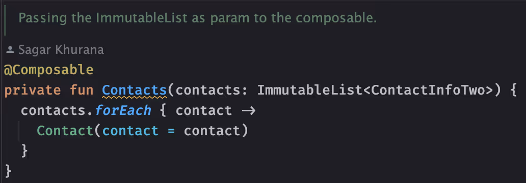 So, the contacts parameter is treated as unstable. If you are wondering why, 🤔 it’s because Composable takes a List (Collection Type) as a param, an interface. The Compose compiler cannot be sure of the immutability of this class as it just sees the declared type and, as such, declares it as unstable as the implementation could still be mutable. So, Compose recomposes the Contacts composable on every recomposition because Compose is sure about whether the unstable params changed or not.