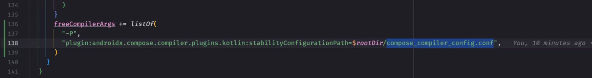 To use the Compose Stability Config File, we must define a compose_compiler_config.conf at the project's root, as described in Figure PS2. It can be provided to each module separately, but I added it to the subprojects. So, there is one file that we need to maintain, and all the modules can benefit from it.