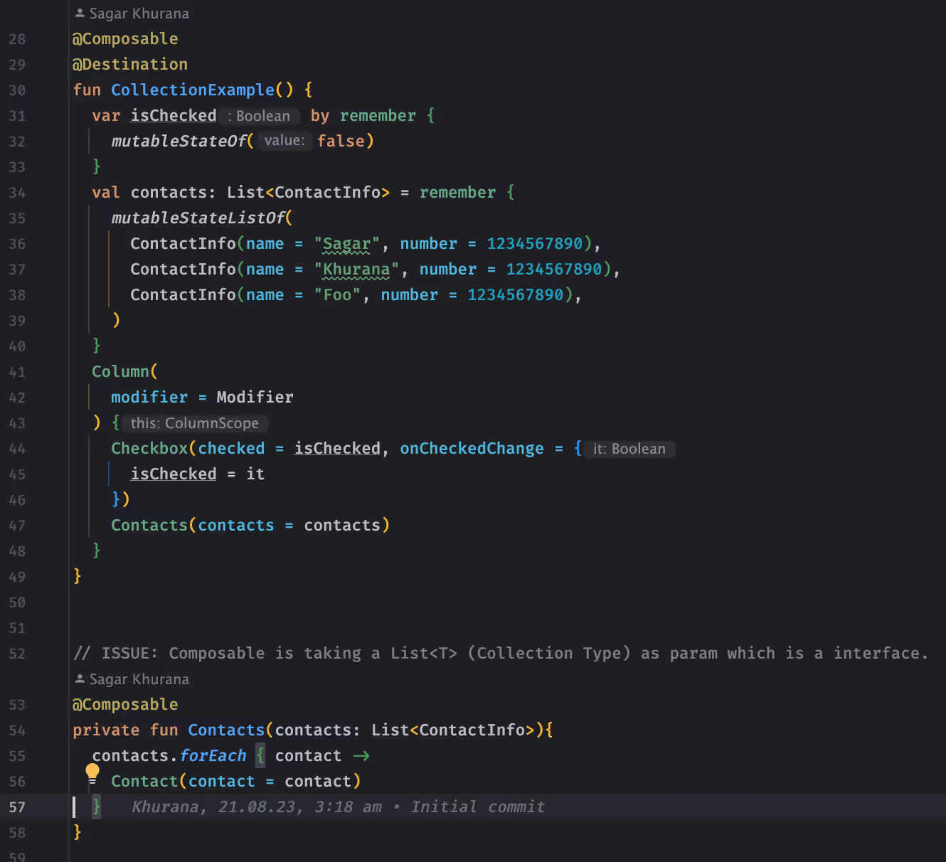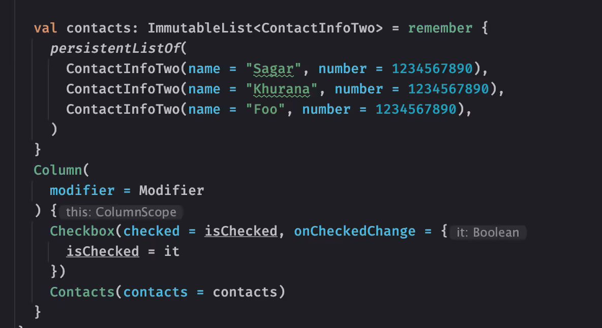 In this code, we have a Column with Checkbox and Contact Composable, which takes a ContactInfo data class. On Click of Checkbox, isChecked Boolean is changed, triggering the recomposition.