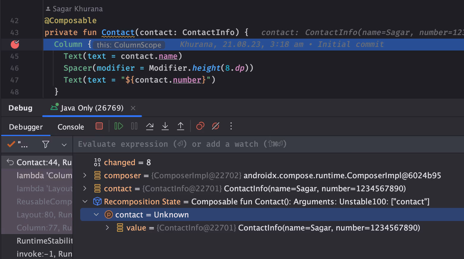 There’s also another option to see what the cause (which in this case is an unstable param) of recompositions is using the debugger; this is only available in Android Studio Hedgehog | 2023.1.1 where it shows Compose state information in the debugger and which explains about if the variable is