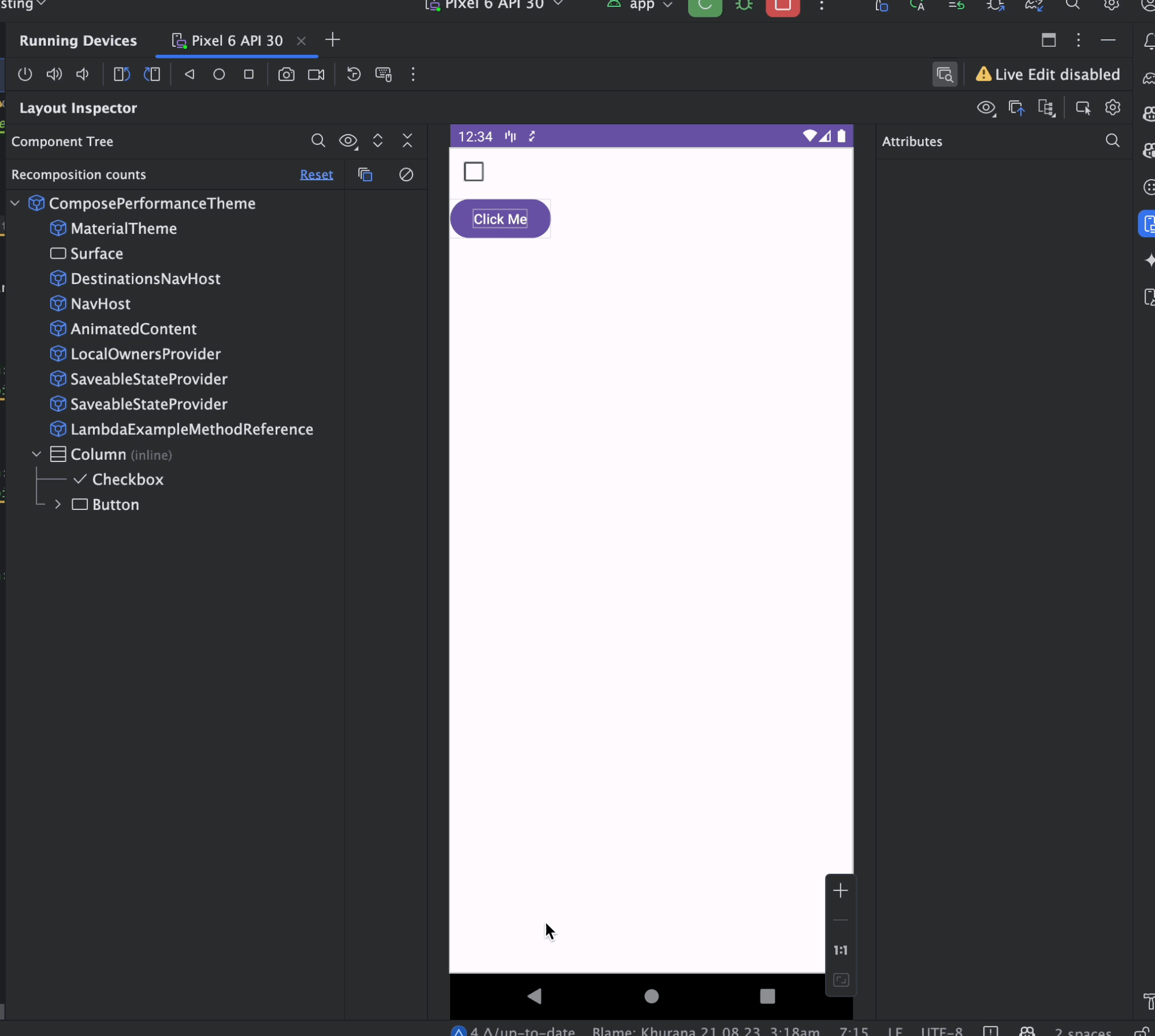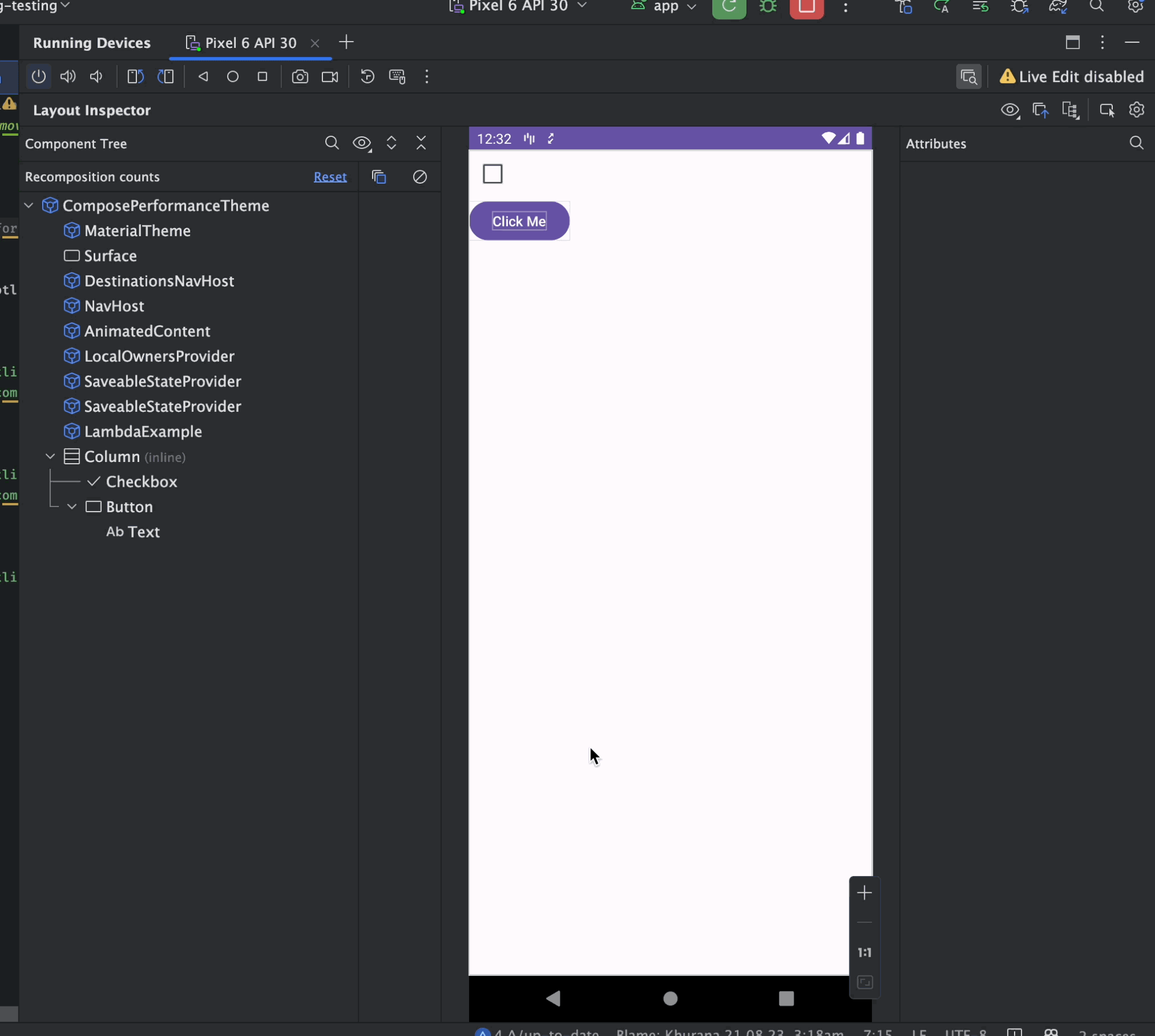 This code has a column with a checkbox and a Button that can be combined. When the checkbox is clicked, the isChecked value is inverted, and recompositions trigger.