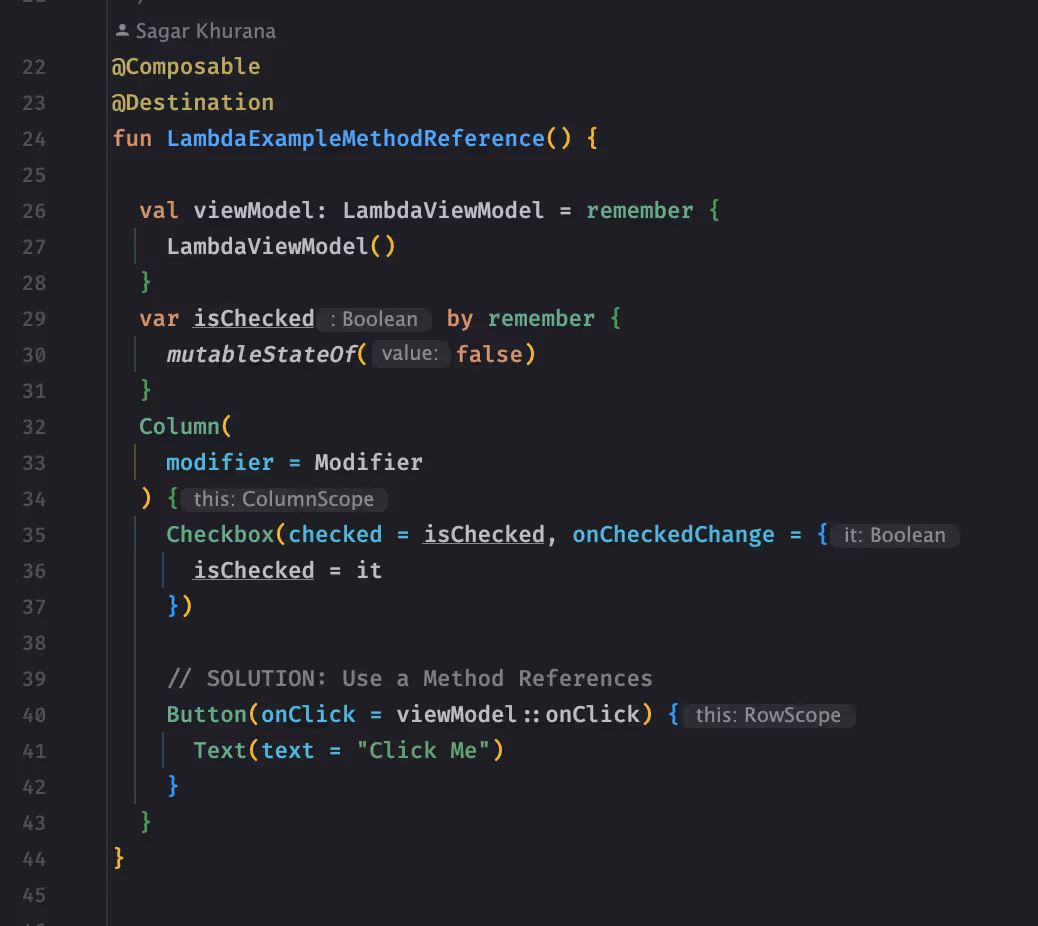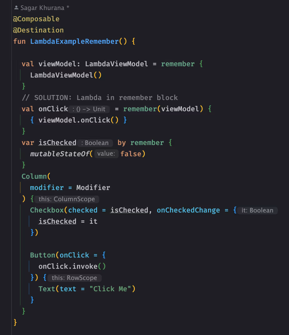 Now, inside the Button Composable onClick param, pass the remembered lambda value.