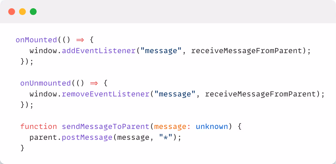 When a page loads, the current state from the old app is transferred to the iFrame component as a JSON message via the window’s postMessage() API. After a user finishes editing and clicks save, the iFrame sends a message back to the parent app, ensuring seamless state synchronization between the old and new systems. If you are using the code snippet as a blueprint, make sure to replace the wildcard symbol with your own targetOrigin value.