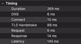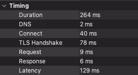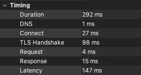 As we can see, reusing the same URLSession instance, so reusing the open TCP connection, gives us a faster total time (Duration) by shaving from the delta the latency for the DNS lookup, establishing the TCP connection, and to make the TLS handshake. Important to note the other values fluctuate due to the environment and each connection stability over time.