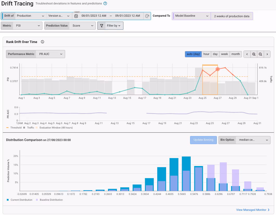 After deploying our model and making online predictions, we still need to ensure it functions well in production. Our ranking model has 51 features describing a wide range of activity and user properties, split between many different types and ranges of values. To ensure that our model behaves as expected, we need to monitor the input features during training and inference, as when problems arise, they can often be traced back to the data itself. To help us keep an eye on this, we use Arize to create data quality and drift monitors for our features so that we can promptly get alerted on Slack in case there are any significant deviations in data quality or distributions. In particular, the feature drift monitors are very valuable as feature drift can be very common in the real world, and it’s easy to remain undetected while our model is in production. Arize can measure the feature drift using a reference dataset, which we have set as the last two weeks of production data in a moving window manner. Drift monitors then compare model feature distribution over time using metrics such as PSI, KL Divergence, and more.