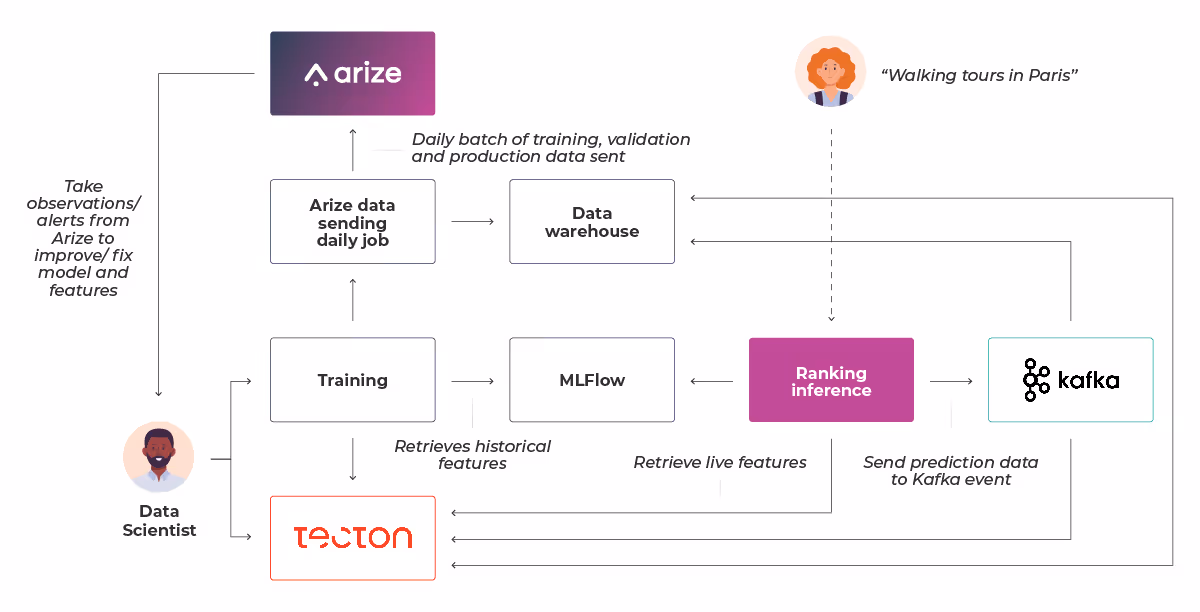 We adopted Tecton as our feature platform and Arize for model observability to tackle these challenges. They fit nicely with our existing tech and help us create new features for user personalization while also giving us a clearer view of how our models perform in production and whether any changes in features or model behavior need addressing.