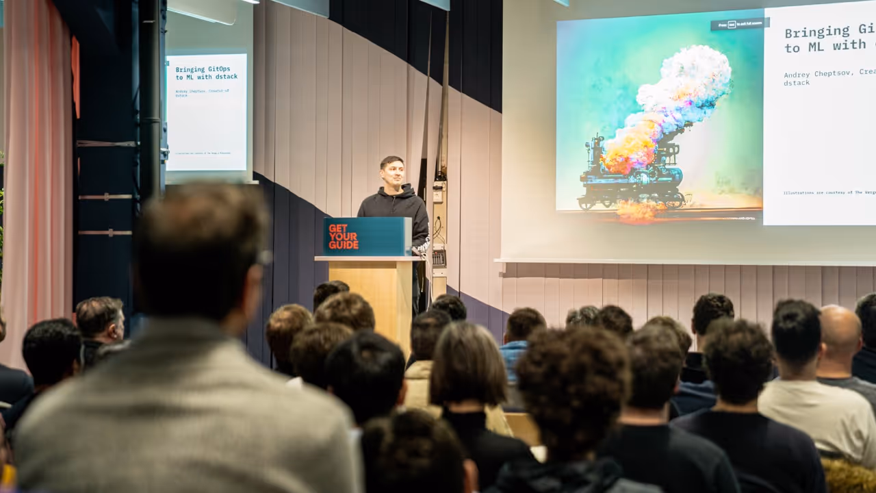 The first talk of the day was presented by Andrey Cheptsov, the creator of dstack, an open-source tool that facilitates ML experiments. He spoke about "Bringing GitOps to ML experiments with dstack" and demonstrated how GitOps, a DevOps practice, could improve the software shipping process. Andrey's commitment to his work was evident in his ability to break down complex data topics quickly and easily.