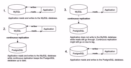 The simplest scenario for a database engine migration is one where your service can accommodate downtime. Once code changes are ready to be deployed and service is down, create your new database, copy data over, and deploy the new service. Ideally you will have tested this whole flow prior in a testing cluster.