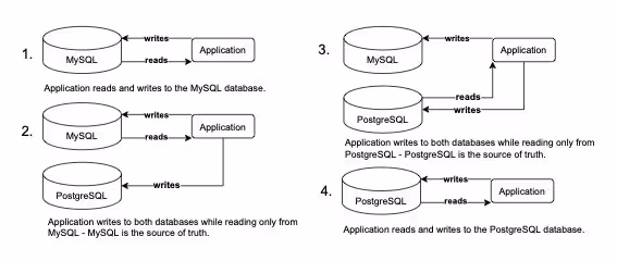 In practice this introduces a large amount of overhead, code duplication, and complexity. On the flip side, this approach allows you to write to both databases prior to the switch – you can test your code while the old database is still kept up-to-date – removing risks of data corruption and keeping the possibility to rollback without data loss. However, the extra amount of code and complexity you introduce to your service also comes with risks. Finally, this approach requires a significant amount of effort and time.