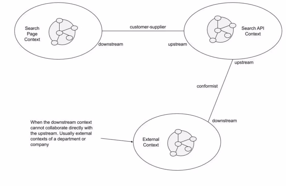 Conformist is also an upstream/downstream relationship between two bounded contexts. The difference is that the upstream system has no idea of the existence of the downstream and changes in this upstream are not demanded by the downstream, which means the downstream uses the upstream at its own risk. Usually this pattern is used in the short term for experimentation or when your organization has two teams that are far from each other in communication.