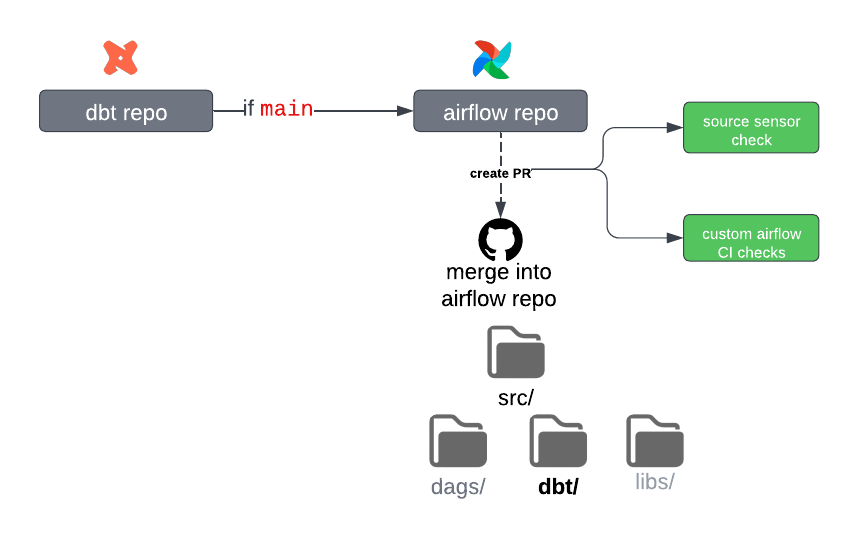 However, we quickly encountered a best-practice challenge. Since Airflow and dbt are fundamentally different technologies serving distinct purposes, combining their respective files in a single repository would complicate maintenance and violate the separation of concerns. Therefore, we opted for a cleaner solution: maintaining separate repositories for dbt and Airflow, connected through an automated CI/CD workflow that syncs dbt changes into the Airflow repository. As illustrated in the diagram above, whenever changes are merged into the main branch of our dbt repository, an automatic pull request is triggered to merge these changes into the Airflow repository. This PR then undergoes rigorous CI/CD checks, including both generic validations and custom Airflow-specific tests, ensuring nothing breaks in production.