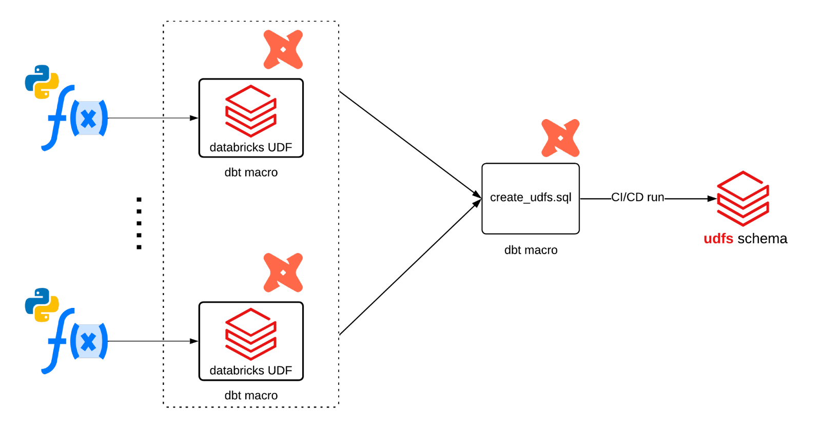 However, the migration wasn’t without hurdles. One significant challenge was the handling of User Defined Functions (UDFs). Our previous setup relied heavily on Scala UDFs, which, unfortunately, are not supported by SQL warehouses at the time of writing. This forced us into a comprehensive refactoring effort, converting Scala UDFs into Python-based implementations compatible with SQL warehouses. To systematically address this, we adopted a structured approach: each UDF was encapsulated into its own dbt macro, leveraging Databricks' CREATE OR REPLACE FUNCTION syntax. A master macro, create_udfs.sql, was then developed to iterate over these individual macros, executing each through dbt's run_query command for modular deployment. This innovative method allowed us to maintain clear, version-controlled definitions of our UDFs directly within our codebase, ensuring consistent deployment and easy management.