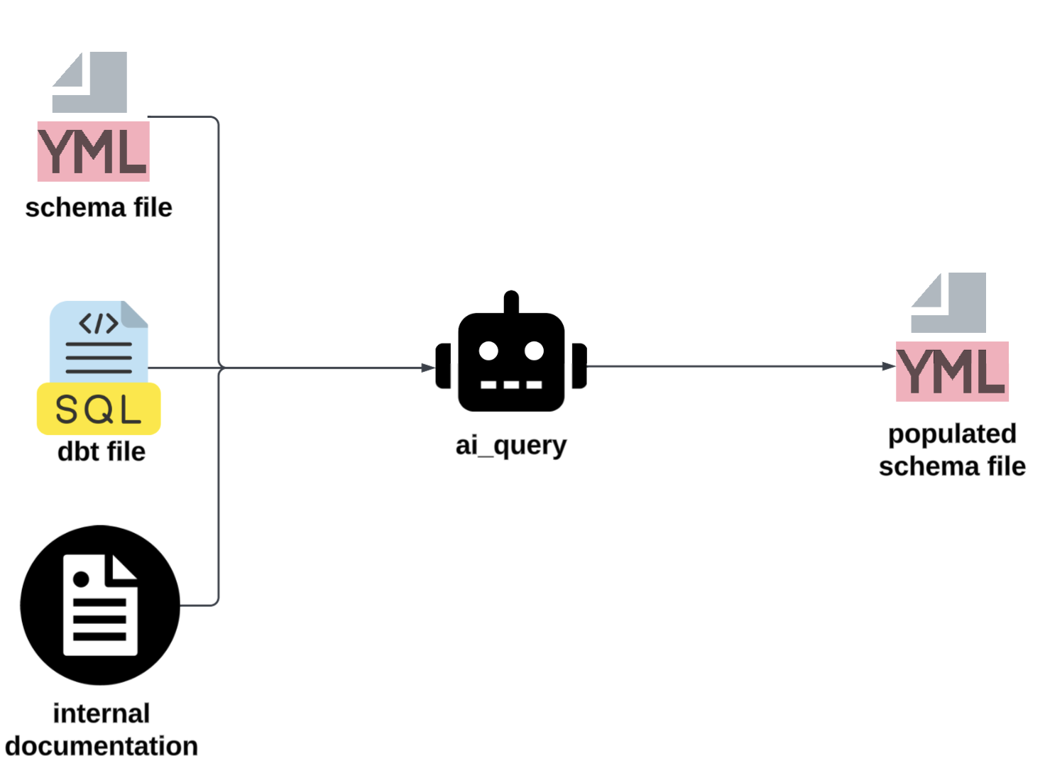 The process, illustrated clearly in the diagram above, involves taking these three sources: the schema YAML file, the dbt SQL file, and our internal documentation, and feeding them into the ai_query command. The AI then synthesizes this information to produce a fully populated schema YAML file, complete with detailed, accurate, and insightful column-level documentation for each dbt model. This approach not only saves significant time but also ensures consistency and quality across all of our documentation.