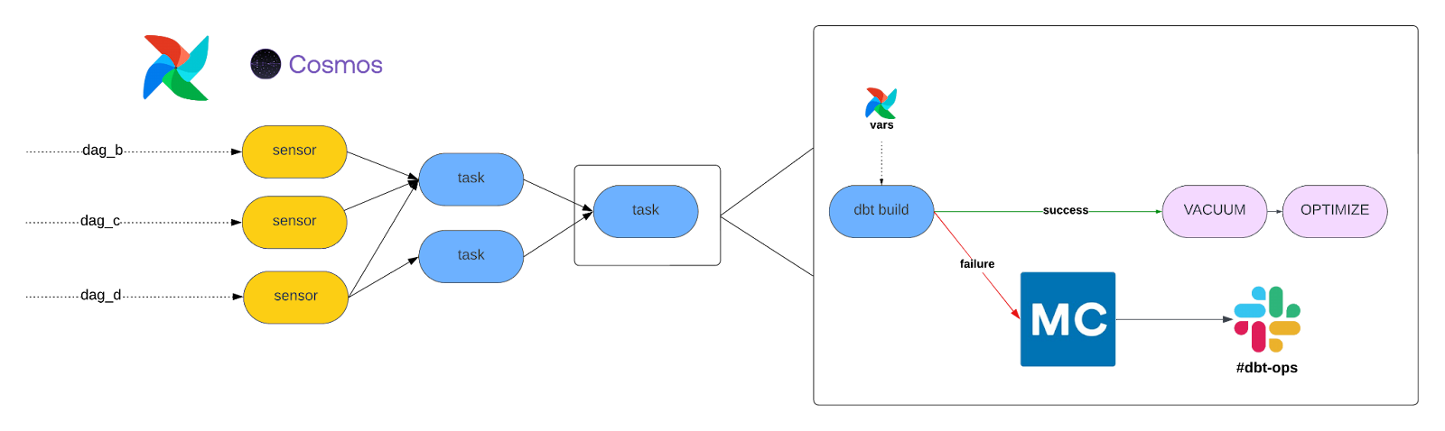 Furthermore, Cosmos allowed us to seamlessly integrate native Airflow functionalities such as task retries, alerts, and data lineage tracking into our dbt workflows. We could run dbt models directly against Airflow connections, eliminating the need for separate dbt profiles. This integration significantly streamlined our data operations, enabling us to utilize dbt's vanilla products alongside Airflow's extensive add-ons, ultimately improving operational efficiency and reducing the overhead associated with managing separate tools and workflows.