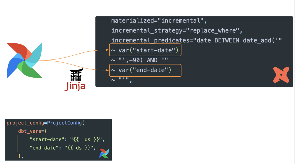 One quick win involved leveraging Airflow Jinja templating with Astronomer Cosmos, which significantly simplified our handling of dbt incremental models. As depicted in the image, we dynamically replaced dbt model variables with Airflow’s Jinja template variables representing the execution date. This allowed us to efficiently schedule and execute incremental dbt runs directly through Airflow. By integrating Jinja templating, we could easily define dynamic date ranges for incremental predicates, making our workflows more flexible and adaptable to changing data conditions. This integration provided multiple advantages, notably simplifying the orchestration and improving the maintainability of our incremental data pipelines. By using Jinja templates, we avoided hardcoding dates or manually updating variables, thus reducing errors and operational overhead.
