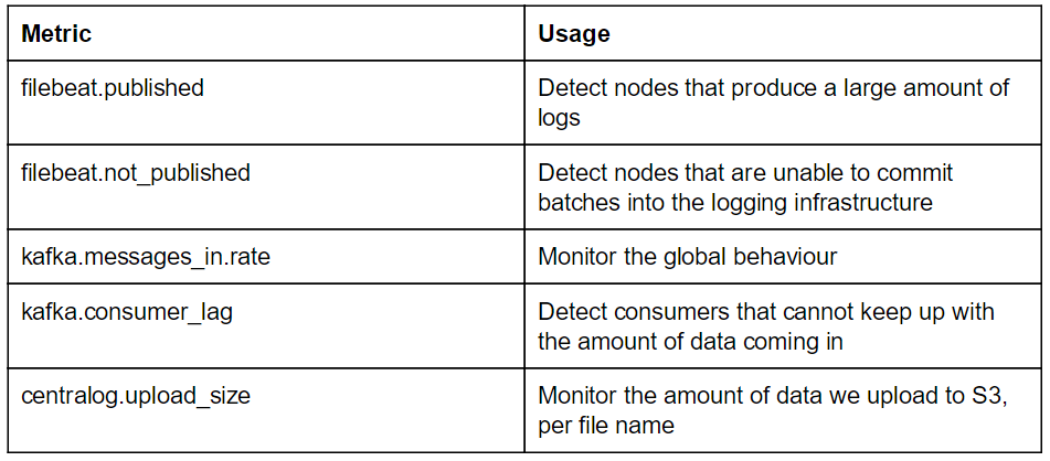 To be on top of everything, we set up monitors collecting metrics from various parts of the system. These monitors produce data into the local StatsD forwarder, and based on this we defined alerts in DataDog. A few examples of these metrics are: