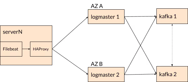 To avoid that, we started by multiplying the nodes in different availability zones. By having a full mesh connection between logmaster nodes and Kafka nodes we are sure that data will reach the storage, as long as one node is still up. On the producer side, Filebeat pushes data to a local HAProxy instance and that load balances the connection to all known healthy logmaster nodes. We get health information using Consul and we update the HAProxy configuration fully transparent to the Filebeat process.