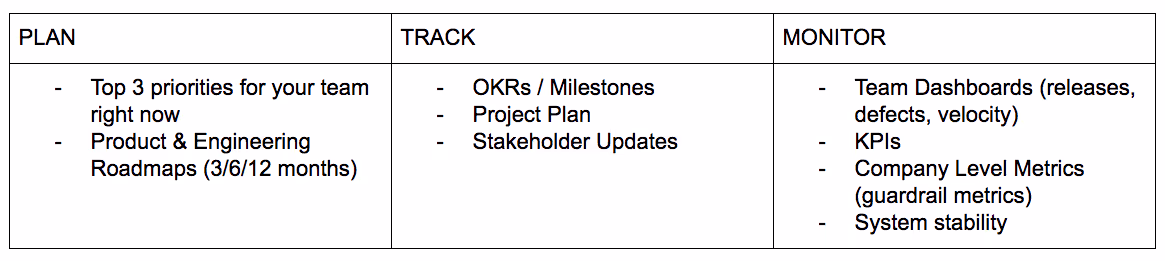 We suggest a simple Plan/Track/Monitor framework. This will help you make sure you are covering long-term thinking and short-term execution while also ensuring your activities do not have any side effect on other teams.