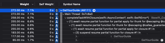 Note that the Weight column doesn't show how much time each function takes to run once, but how much time it was present/running in total in all the samples Instruments took while profiling. This means that very fast functions won't appear since they were never present in the samples. The data we present here is trustworthy only because we used a script to run the exact same actions at the exact same time, so there wouldn't be any human interaction that could affect the results. If you check it on your project, I would highly recommend doing the same.