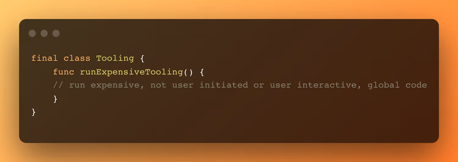 In theory everything that does not affect the user interaction should be done in a separate thread other than Main by using the semantically defined QoS classes. Of course this may bring more complexity to how we architecture and build our app, especially if we start spawning new queues, which can decrease the app performance by making use of time slicing, or for handling deadlocks and thread explosion. So, as a rule of thumb, we could say to at least invest in running all the tooling in separate threads and explore a more refined (and complex) approach when necessary. For tasks that should run in the Main thread for any reason, profile it and try to find possible optimizations so it can decrease its running time footprint.