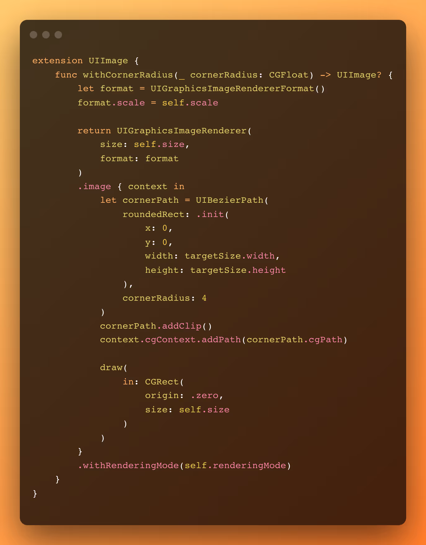 Now taking the example from the Off-screen rendering point from part two, we can apply the cornerRadius directly on the UIImage instead of applying it to the UIImageView.