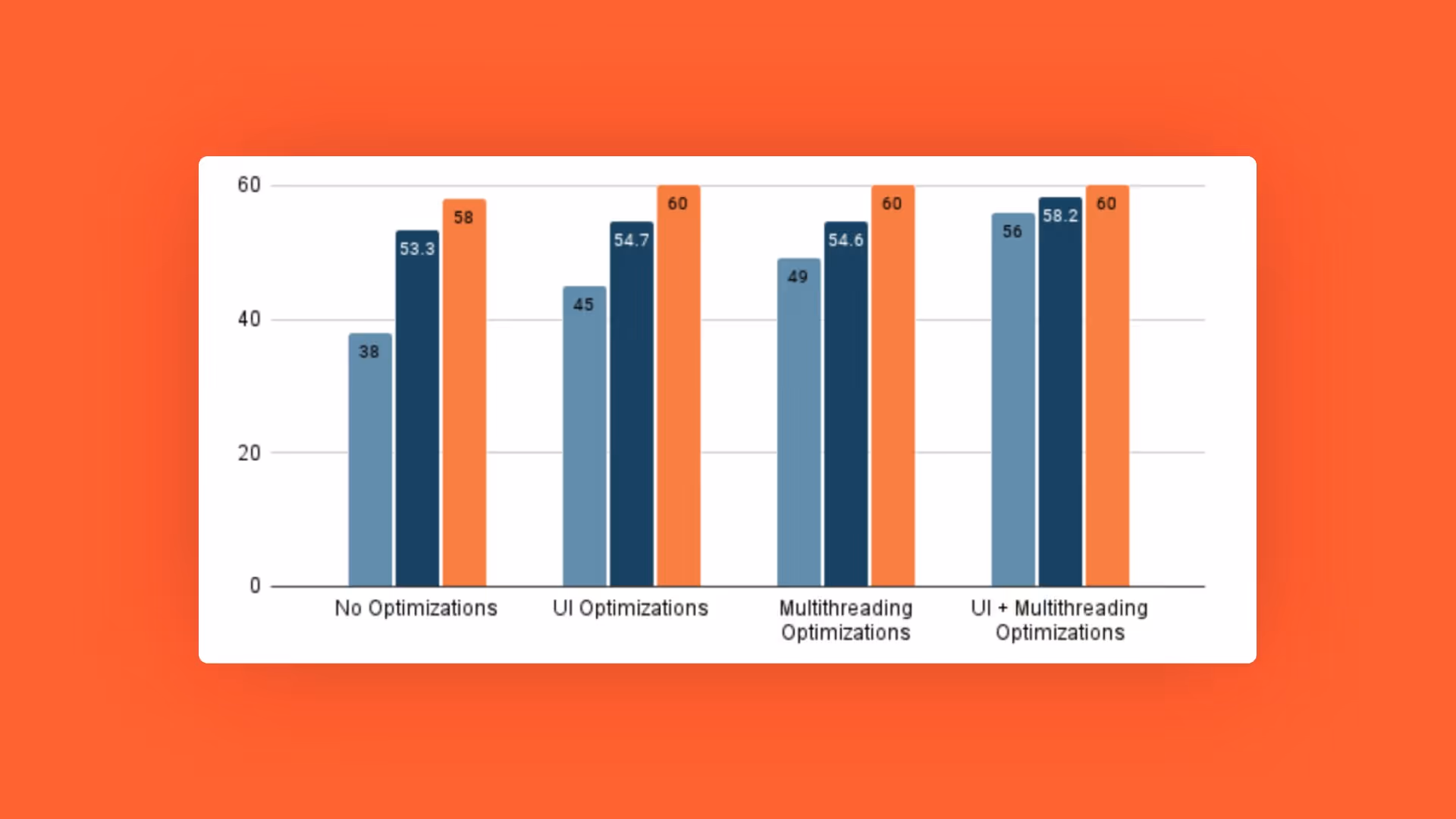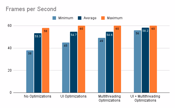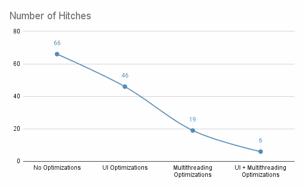 These changes are so powerful that by only applying them in isolation we were able to drop the number of animation hitches by ~70%, improve the average FPS by ~3% and the minimum FPS by ~30% when comparing to our benchmark seen in part two. The result can be seen below: