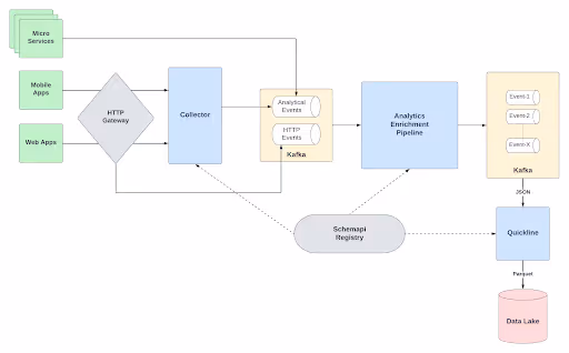 - Collector - It’s still our ingestion service. But in this iteration it’s much more lightweight. It just receives events to validate their schemas and publish to an intermediate topic for analytical events.