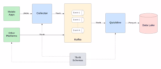 - Quickline - A simple Kafka consumer written in Java. It consumes all the event topics, converts them to parquet using Thrift schemas, then dumps them to S3.