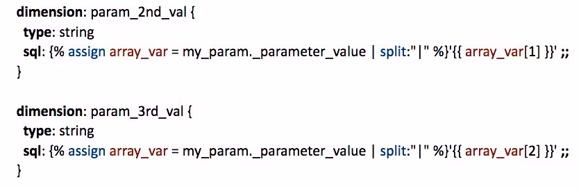 If you read Looker’s documentation on parameters, you know we can suggest values for the parameter from an Explore, which in this case would be based on our Config table. That being said, it isn’t possible to display one value, i.e. experiment name, and get some other value i.e. experiment start date as a return from a parameter when using explore-based suggestions. Luckily, Liquid templates have a “filter” feature which allows us to manipulate values. Liquid filters are like functions; we can do a substring or split a string into an array and extract specific elements. Since this is not explained in Looker documentation, let’s see how it works: